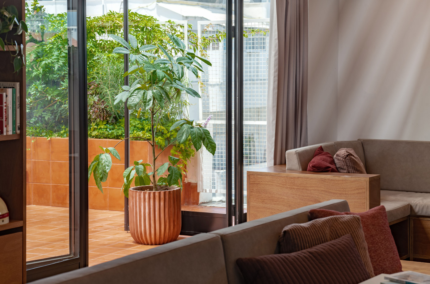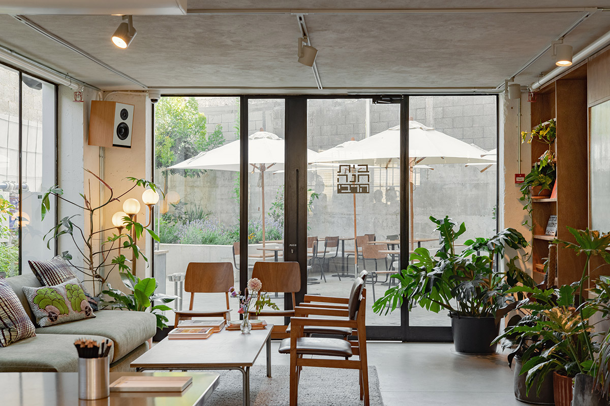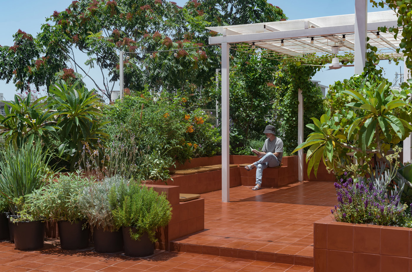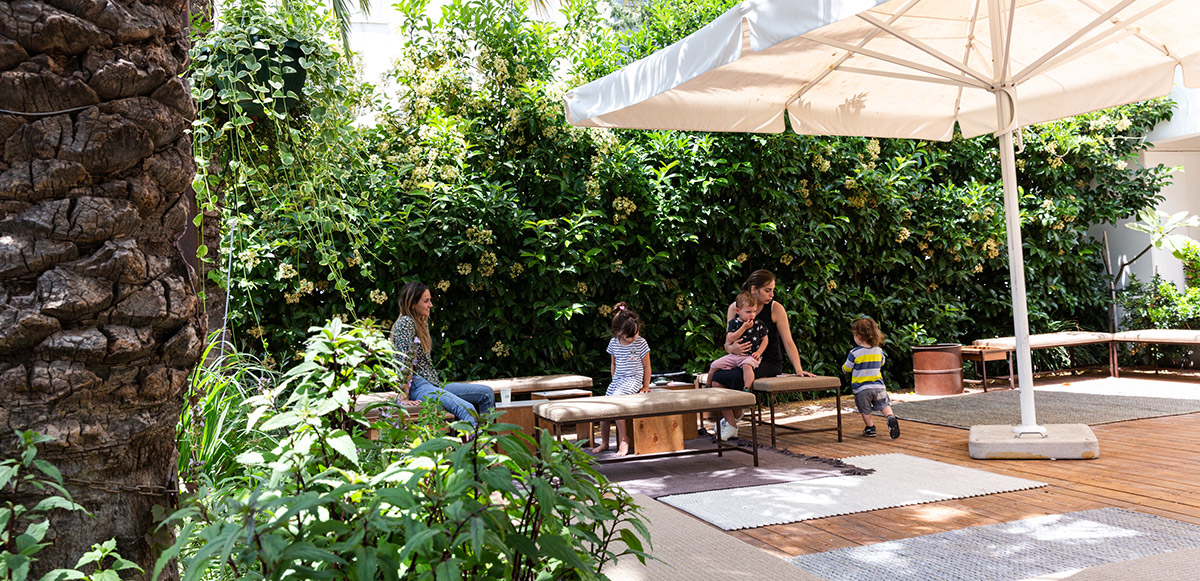 חצר שקטה וירוקה באמצע העיר. מרוהטת בכיסאות נוח, ספלסלים, שמשיות גדולות וגרילנדות. מתחילים את היום ביוגה על רצפת הדק ומסיימים בהקרנת סרט על חזית הבניין.