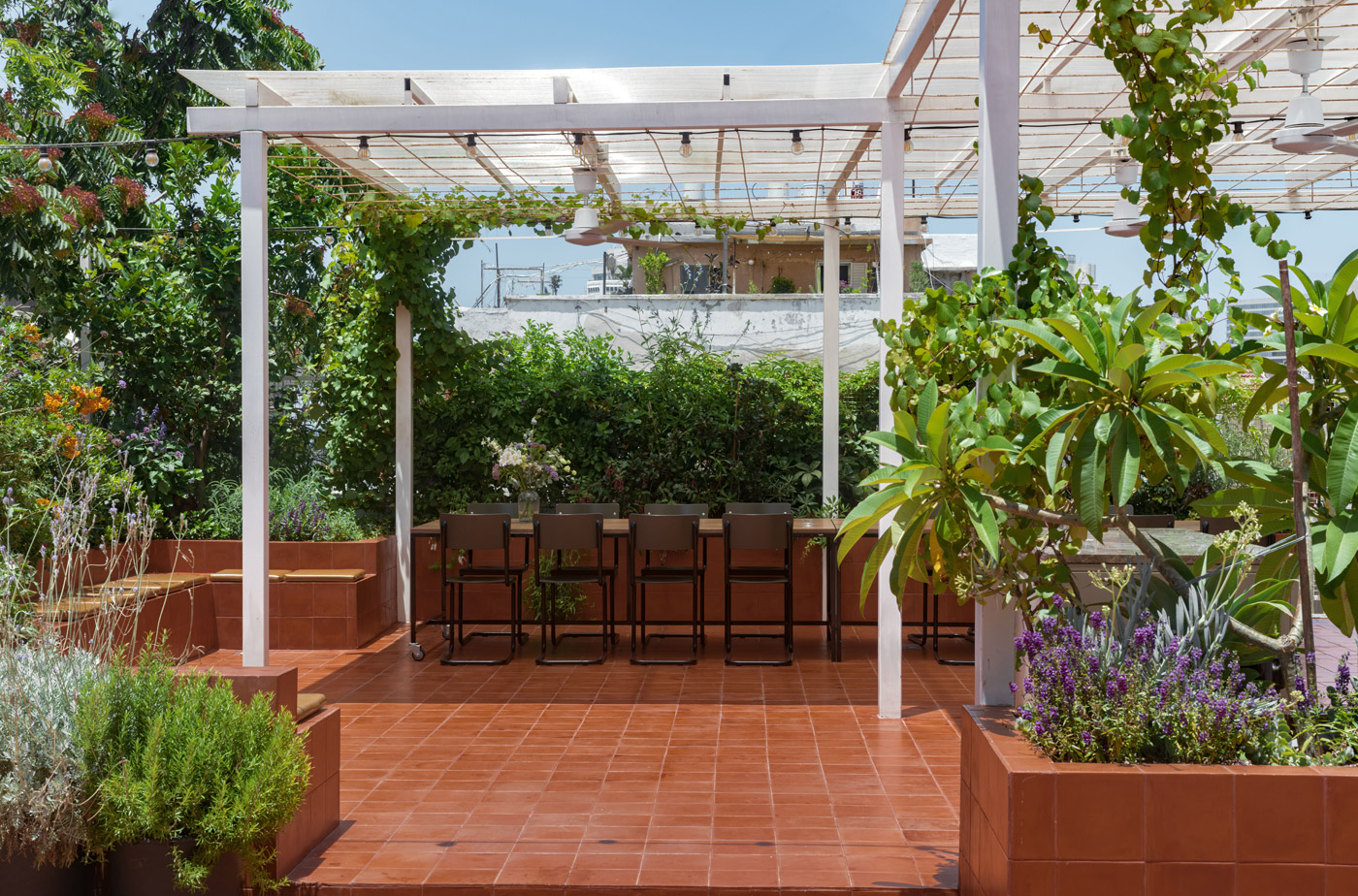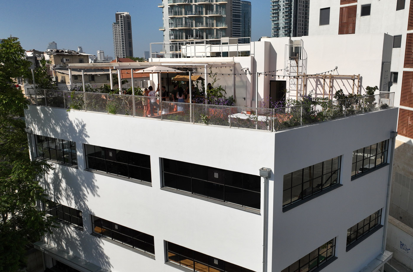 גג פתוח הצופה על דרום העיר, עם סככת גפן להצללה ושולחן גדול מלבני. אי להגשה, פינות ישיבה חמודות ואפילו מתקן כושר. מאוד מתאים לאירועי מינגלינג וסדנאות פרטיות.