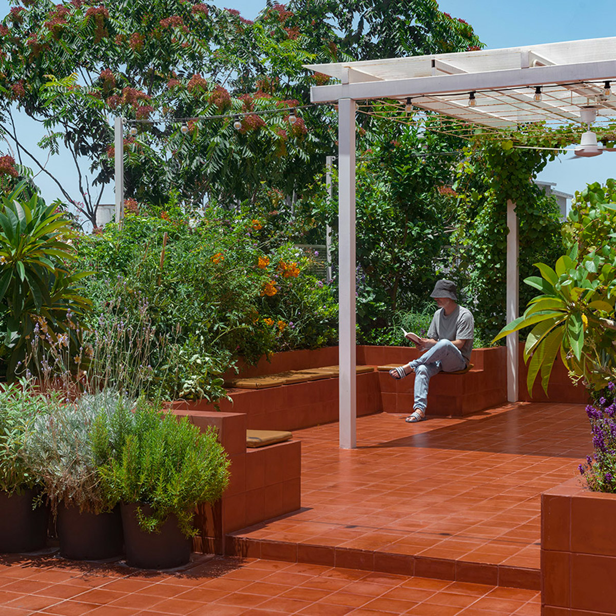 כיתה שקטה בקומה האחרונה לצלילה עמוקה בעבודה ובלמידה, עם יציאה למרפסת פתוחה עם שולחן עבודה, גפנים ועשבי תבלין שמותר לקטוף כדי להכין כוס תה.